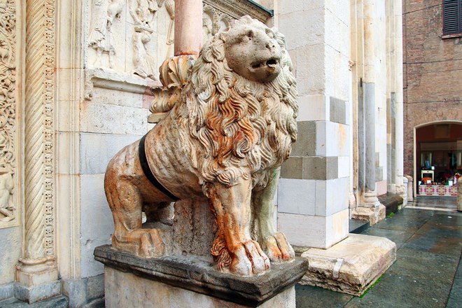 Anche il Duomo di Modena ha i suoi celebri leoni stilofori: si trovano alla base dei portali laterali e sorreggono le colonne dei protiro, cioè i piccoli tetti sporgenti dell’ingresso.