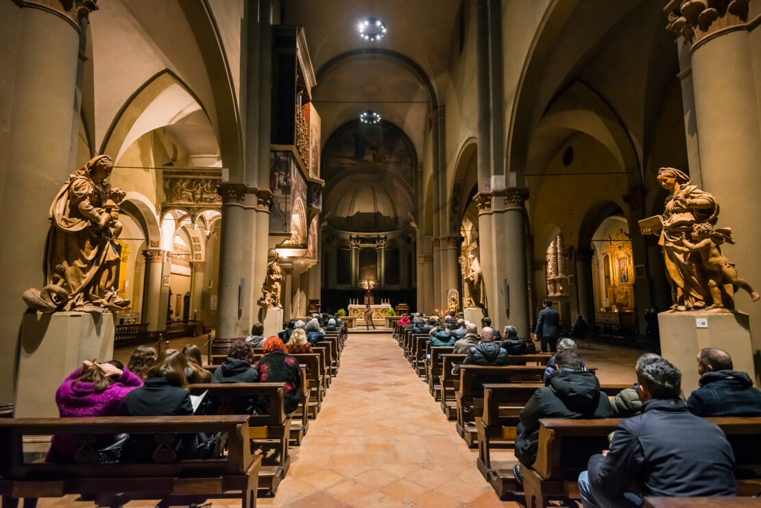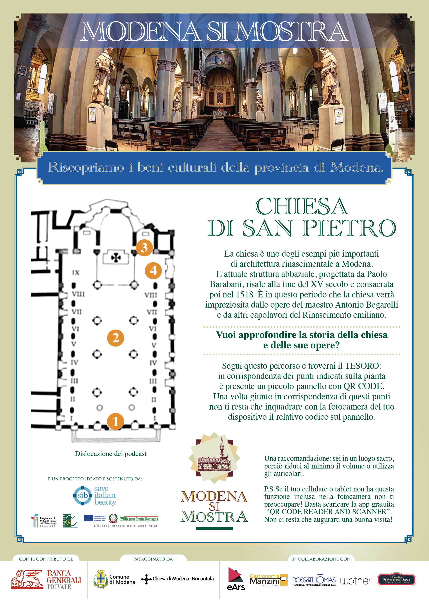 Per la chiesa di San Pietro sono stati prodotti quattro podcast: il primo dedicato alla chiesa che, annessa al monastero del riformato ordine di San Benedetto, fu costruita a partire dal 1476, terminata nel 1506 e consacrata nel 1518. Gli altri tre podcast riguardano le sculture di Begarelli, uno quelle della navata centrale, quattro delle quali erano state realizzate tra il 1532 e il 1536 per il dormitorio del monastero: San Benedetto, la Madonna col Bambino, San Pietro e Santa Giustina. Trasferite all’Accademia di Belle Arti nel 1796 all’arrivo dei Francesi, ebbero la collocazione attuale nel 1806 e a queste si aggiunsero San Francesco e San Bonaventura dalla soppressa chiesa di San Francesco. Il terzo podcast è dedicato alla Pietà realizzata tra il 1544 e il 1546 e collocata nella cappella del Santissimo Sacramento a destra del presbiterio. Il quarto all’altare delle statue o monumento funebre dello scultore collocato nel presbiterio, in fondo alla navata destra.